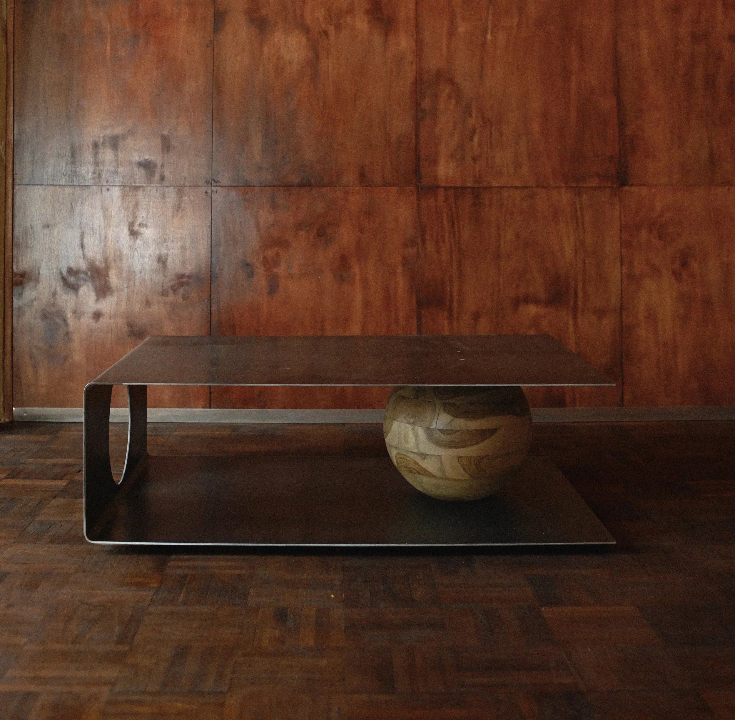 CT001-03 COFFEE TABLE crafted from raw hot-rolled steel, balanced over a carved laurel wood sphere that acts as its anchor. A circular opening on the side reveals the sphere from any angle, allowing the structure to be read as both object and composition. MATERIAL: hOT ROLLED RAW STEEL & LAUREL BAY WOOD MEASUREMENTS (CM): 75 X 100 X 32 INQUIRE